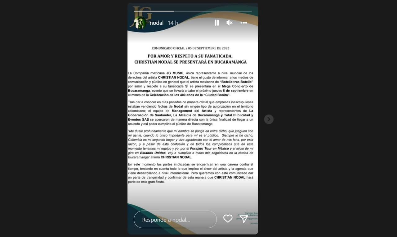 "Tras dar a conocer en días pasados de manera oficial que empresas inescrupulosas estaban vendiendo fechas de Nodal sin ningún tipo de autorización en el territorio colombiano, el equipo de management del artista y representantes de la Gobernación de Santander, la Alcaldía de Bucaramanga y Total Publicidad y Eventos SAS se acercaron de manera directa con la única finalidad de llegar a un acuerdo y así poder cumplirle al público de Bucaramanga", comparte un comunicado emitido por la oficina de JG Music.