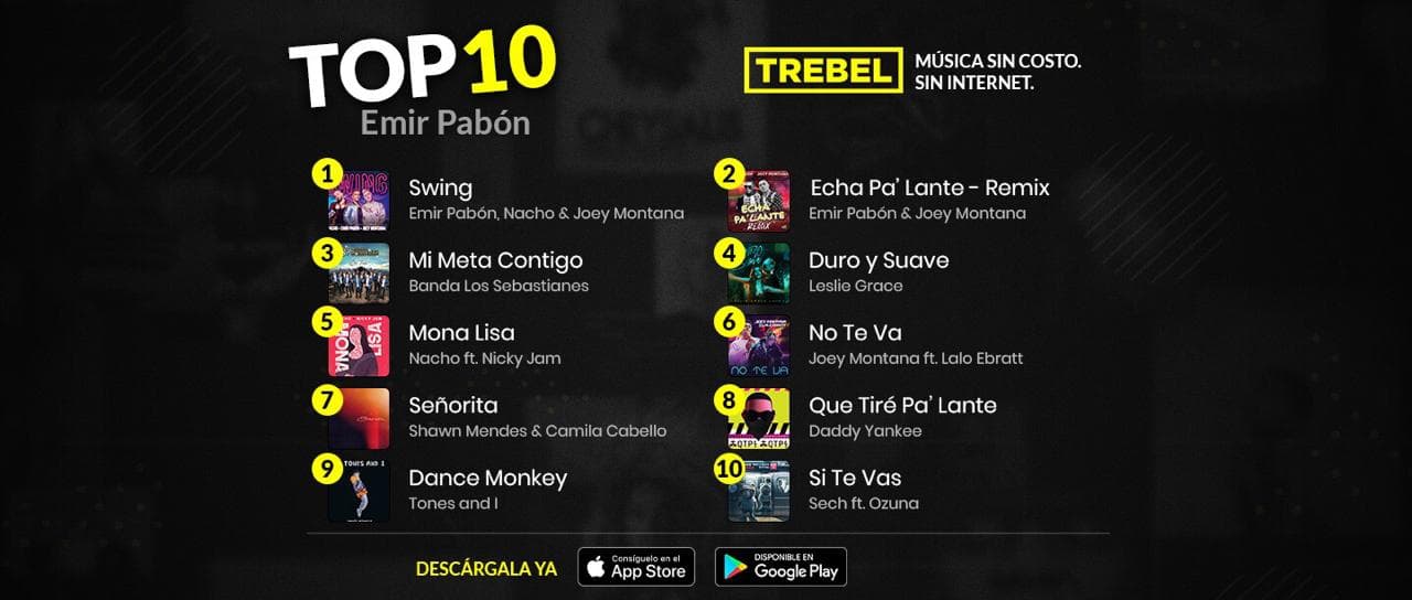 Si deseas escuchar algunos de los éxitos que marcaron a Emir Pabón en este 2019 lo puedes hacer en Trebel, la única app de música en el mundo que le permite a los usuarios escuchar sus canciones favoritas cuando y donde sea, sin costo, y sin usar datos de Internet.
